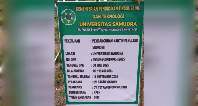 Dari segi plang papan nama proyek, yang tertuliskan. Yaitu, kementerian pendidikan tinggi “sains”. Dan teknologi, universitas samudra. Yang beralamat, jalan Prof Dr Syarief Thayeb. Meurandeh, langsa-aceh. Pekerjaan, pembangunan kantin fakultas ekonomi. Lokasi, universitas samudra. Nomor spk, 164/UN54/SPK/PPK-II/2025, tanggal spk. 30 juli 2025, nilai kontrak. Rp.199.690.000,- tanggal selesai. 12 September 2025, pelaksana. Cv casto victory, pengawas. Cv tetrapod consultant, sumber dana. APBN, tahun anggaran 2025.