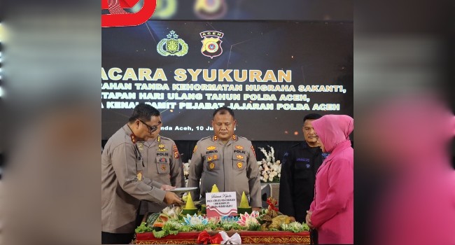 Banda Aceh |Detikkasus.com -Polda Aceh menggelar syukuran atas penganugerahan tanda kehormatan Nugraha Sakanti yang diberikan langsung oleh Presiden Republik Indonesia Prabowo Subianto dalam upacara Hari Bhayangkara ke-79 di Silang Monas, Jakarta, pada 1 Juli lalu. Acara syukuran berlangsung di Aula Presisi Mapolda Aceh, Kamis, 10 Juli 2025.